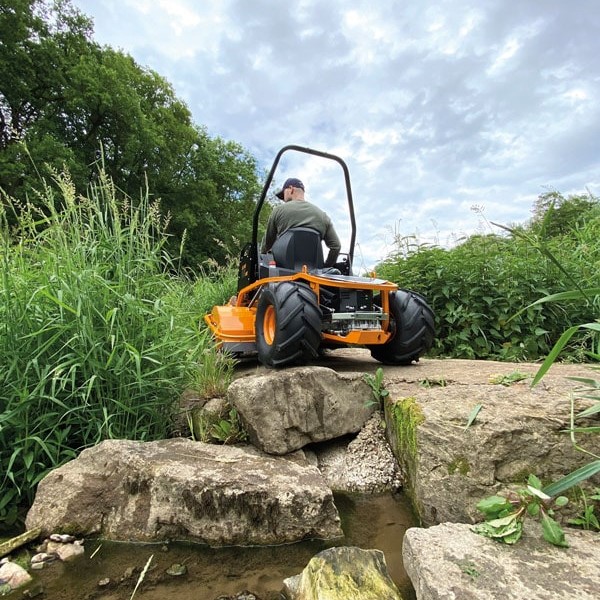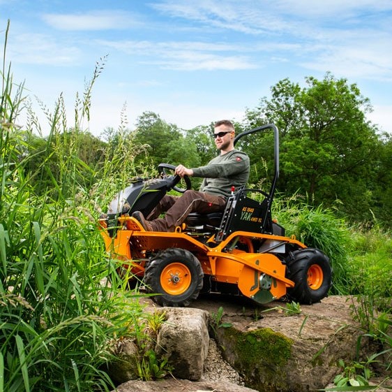 A powerful and durable ride-on flail mower powered by a Vanguard V-Twin engine, cruise control, four wheel drive and an excellent cutting system, perfect for professional use.