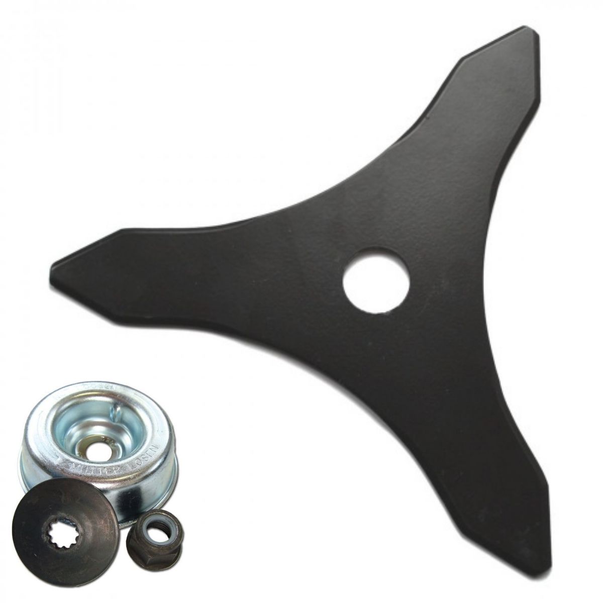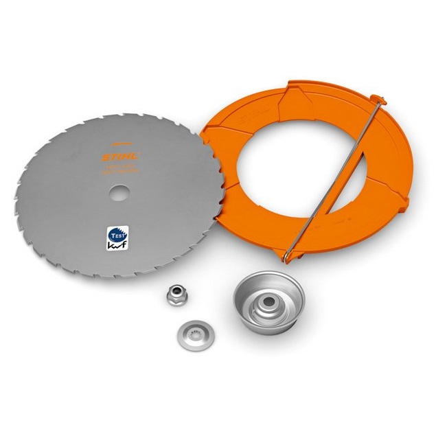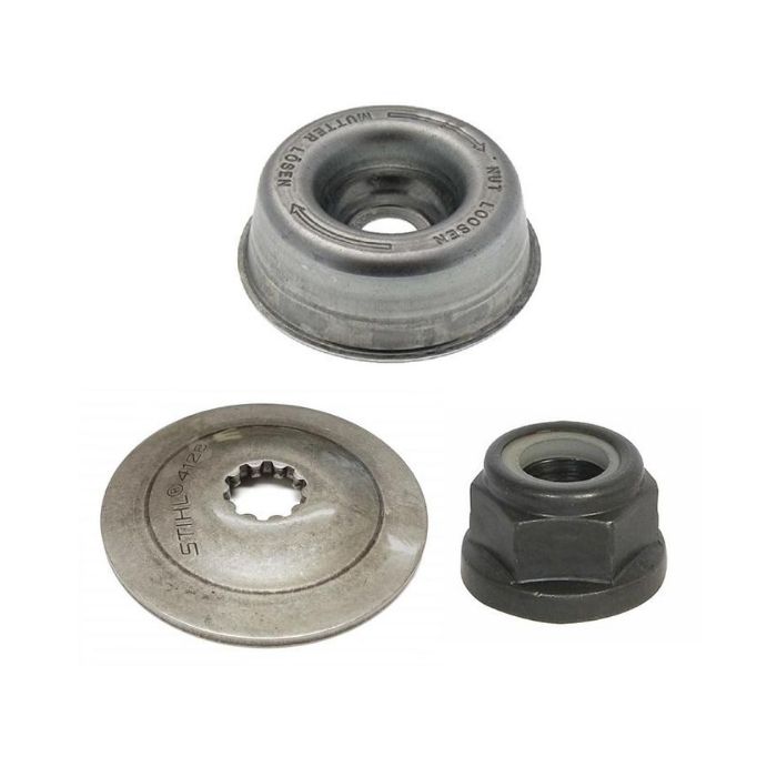 A set of 3 products for fitting a metal blade to compatible STIHL FS-model clearing saws. It comprises of a thrust washer, a left-hand nut, and a rider plate.