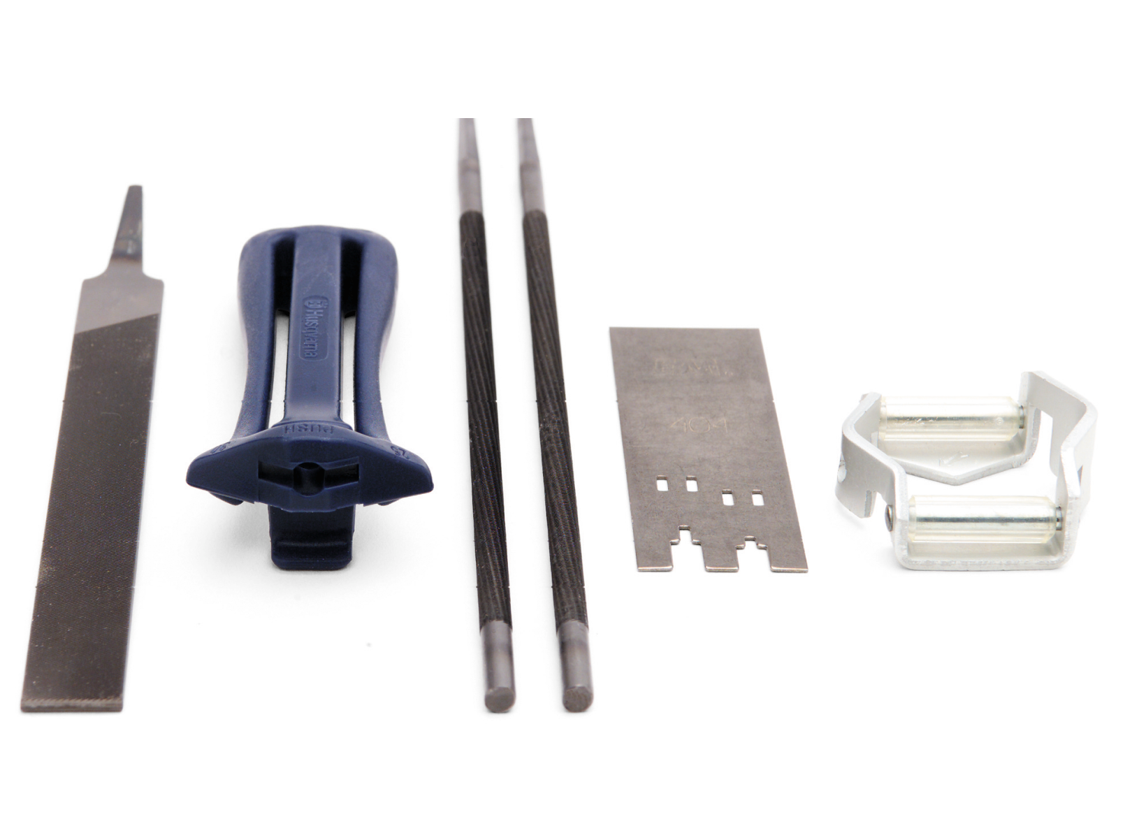 For quickly and easily sharpening the teeth and depth gauge in one action, increasing your maintenance efficiency. Includes round and flat files and ensures a smooth filing action.