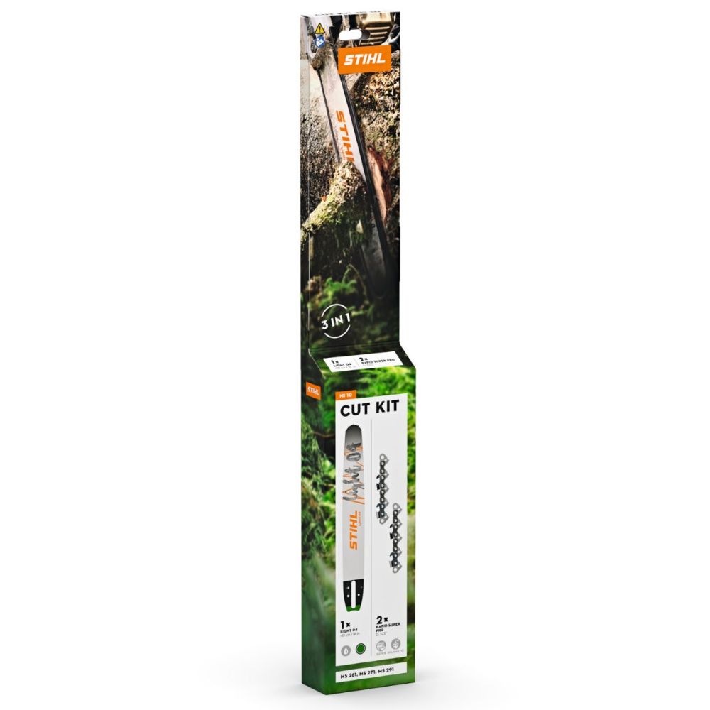 The STIHL Cut Kit 10, for MS 261 & MSA 300 chainsaws, includes a 40cm Light 04 bar and two RS Pro chains, ensuring peak cutting performance with easy QR-guided updates.