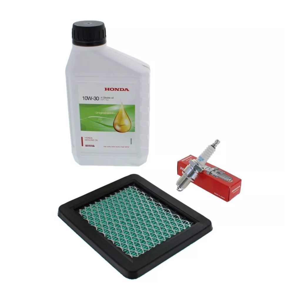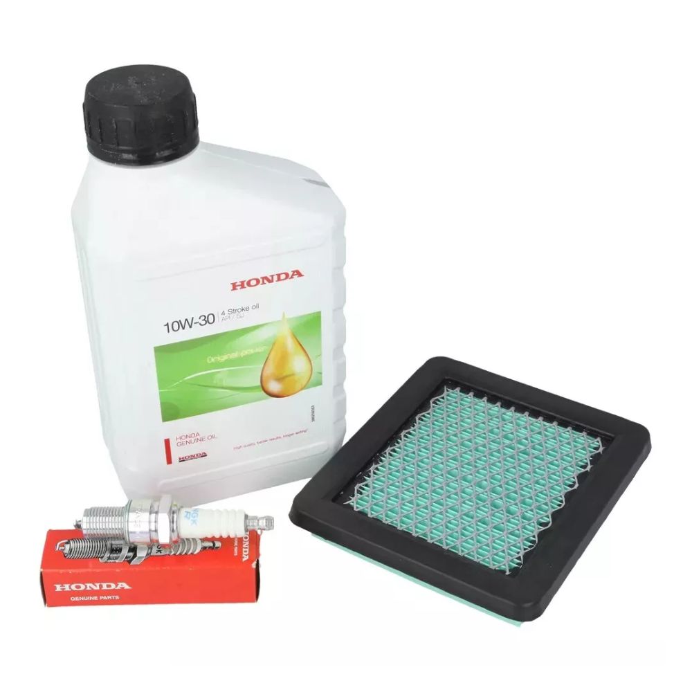Keep your Honda engine in top shape with this genuine service kit. It includes 10W/30 engine oil, an air filter, and a spark plug, all designed to maintain optimal performance and extend engine life.
