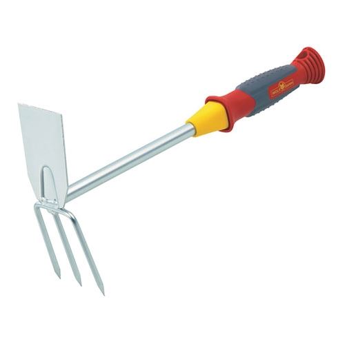 This fixed-handled double hoe is a 7 cm wide tool with two-in-one functionality. It boasts a sharp blade for precision hoeing and three sharp tines to loosen the soil, complete with a comfort grip handle.
