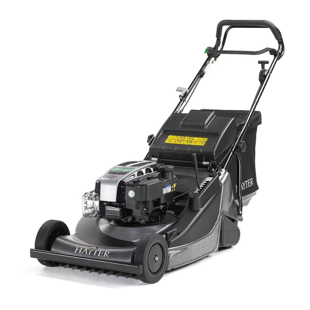 A professional Hayter lawnmower, with a 19-inch cutting width, Honda GCV160 engine and crank safe BBC system.