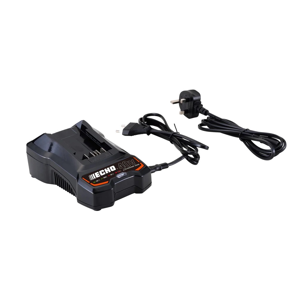 A necessity for charging ECHO’s 40 V batteries; it will charge the 2.0 Ah battery to 80/100 % in 46/60 minutes, and the 4.0 Ah battery to 80/100 % in 97/120 minutes.